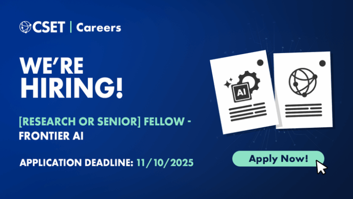 Center for Security and Emerging Technology (CSET) is currently seeking candidates to lead our Frontier AI research efforts, either as a Research Fellow or Senior Fellow (depending on experience). Key responsibilities include shaping priorities, laying out an overall research strategy, overseeing the execution of the research and production of reports, and helping to hire and manage supporting researchers, including (Sr.) Research Analysts and Student Research Assistants. More information on the role can be found here.